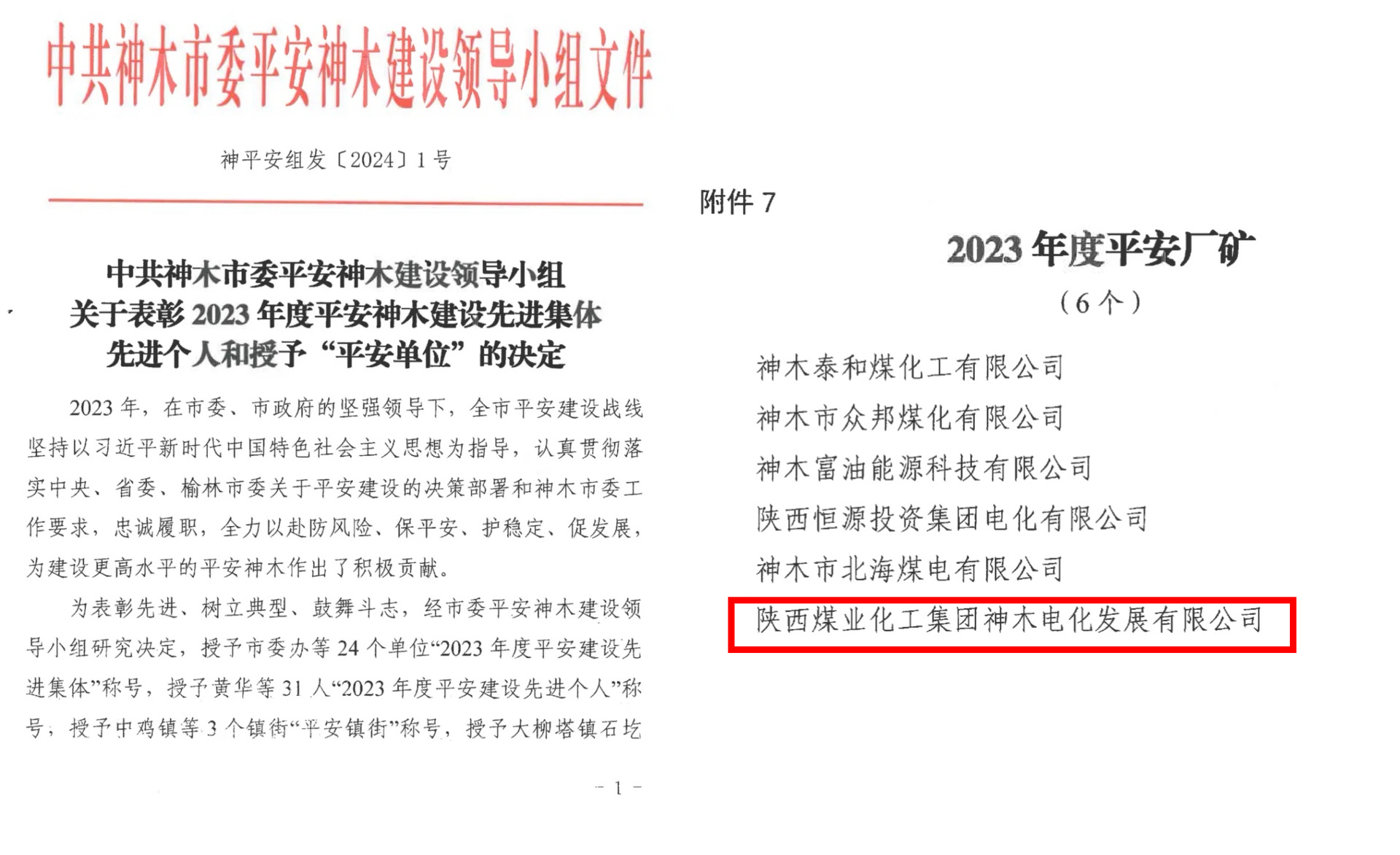 官宣印证实力!神木煤化工电化真人华球体育官网荣获神木市2023年度“平安厂矿”荣誉称号
