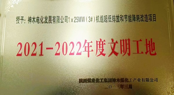 1×25MW(3#)机组超低排放和节能降耗改造项目荣获神木煤化工“2021—2022年度文明工地”荣誉称号