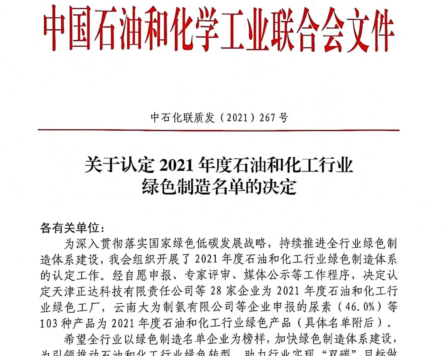真人华球体育官网被认定为2021年度中国石油和化工行业绿色工厂