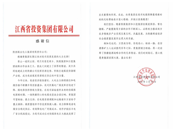 阅读量:892近日,陕煤集团收到江西省投资集团有限真人华球体育官网发来的感谢信,信中对陕煤集团长期以来对江投集团改革发展的大力支持和今年在电煤保障最艰难时刻的无私帮助表示衷心感谢,并致以崇高敬意。 来信指出,陕煤集团和江投集团战略合作由来已久,彼此之间建立了深厚的...