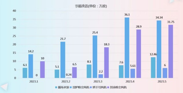 实际数据统计显示,1-5月份循环水泵、出炉除尘风机、烘干引风机及其它除尘风机的节电率逐月稳定上涨。通过对现场设备实施提升改造,进一步优化运行工况,稳定设备运行,最终实现经济节能运行。截至5月底,已累计节约电量280.6万度,预计年节电量可达1100万度,实现创效385万元。