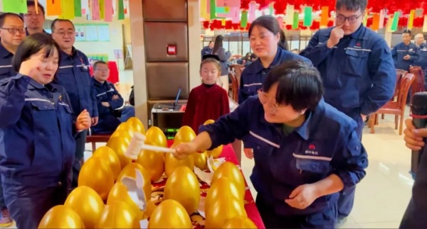 紧接着,趣味游戏环节将活动推向了高潮。“母鸡下蛋”游戏中,参与者们身绑特制道具,通过不断跳动、扭动身体,让“鸡蛋”从道具中掉落,一个个滑稽又充满活力的动作,引得现场捧腹大笑。在“面粉传递”游戏里,大家分组接力,用嘴咬住卡片并小心翼翼传递面粉,既考验了协作能力又凝聚了团队力量。“挤气球”游戏更是热闹非凡,两人一组,背靠背将气球挤爆,现场加油声、气球爆炸声交织在一起,气氛热烈非凡。游戏获胜队伍满怀期待走向金蛋区,拿起锤子,随着清脆的“砰砰”声,金蛋裂开,惊喜奖品一一呈现,然而金蛋的“肚子”里不光全是礼品,还偷偷藏有小小考验,“幸运儿”抽中“特别金蛋”,要说三遍绕口令,绕口令“烫嘴”的词儿,让欢乐的氛围更加浓烈。