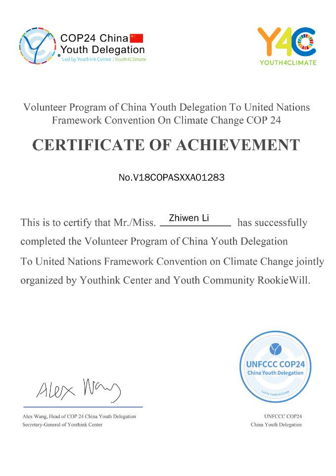 近日,中国青年代表团对李智文同志颁发了第二十四届联合国气候变化大会中国青年代表团志愿者证书。