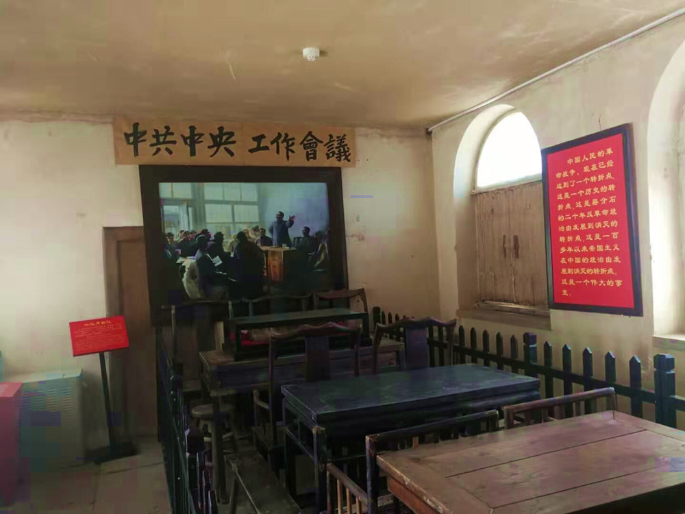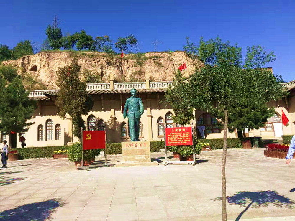逐级攀登,时不时到院子里采摘挂在高处的红枣,来解一解嘴馋,古色古香的窑洞逐渐尽收眼底,才真真切切感受到壮美,脑畔上一面面迎风招展的五星红旗,完美的诠释了祖国富强、人民的安康。怀着崇敬之情,我们来到了毛主席的故居——新院。它有着400多年的历史,由陕甘宁边区著名开明人士马醒民设计,构思精巧,工艺精制,将西方建筑风格与陕北窑洞巧妙结合为一体,典雅雄厚。当他得知转战陕北的毛主席和党中央要来杨家沟驻足时,立即将耗尽半生心血的新院捐献出来供毛主席居住,从此再未踏入。时至今日,新院的院子中央立着毛主席像。正大步向前走,不远处,有一棵百年枣树,树干嶙峋,树上的红枣已被人摘个精光,我们不禁叹息无缘品尝毛主席曾经品尝过的红枣。院子西边有长达百米的防空洞,直达后山,系当时中央机关为躲避敌人轰炸临时挖掘,至今保存完好。穿过防空洞,到达后山院子,院子里立一块巨石,上书写着当时毛主席对时局的高瞻远瞩——曙光!