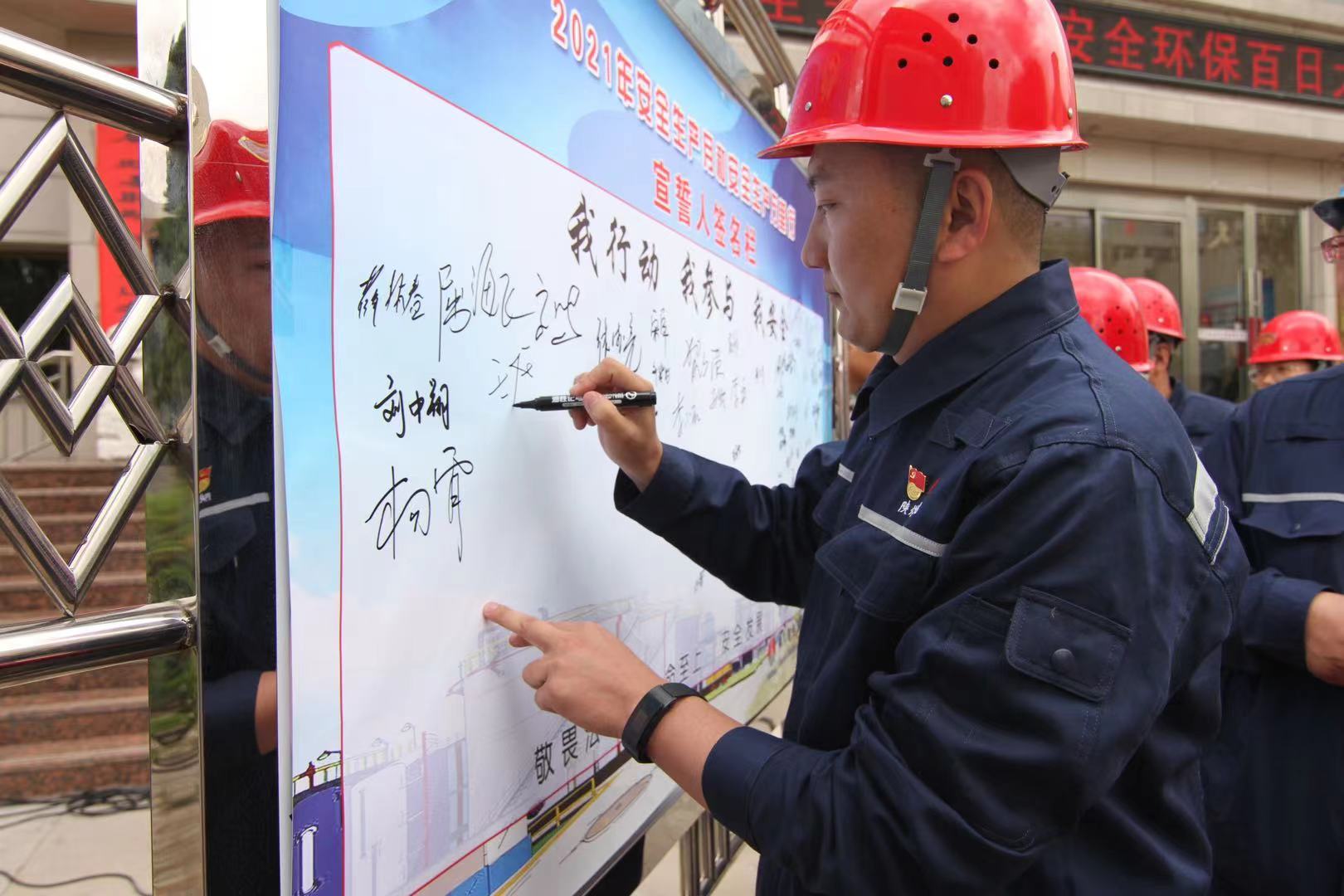 “为了职工的生命安全、家庭的幸福,为了企业的科学发展,社会的和谐美丽,我宣誓......”副总经理张德亮带领全体参会职工,举起右拳,庄严宣誓,并郑重地在誓词签名墙上写下自己的名字。