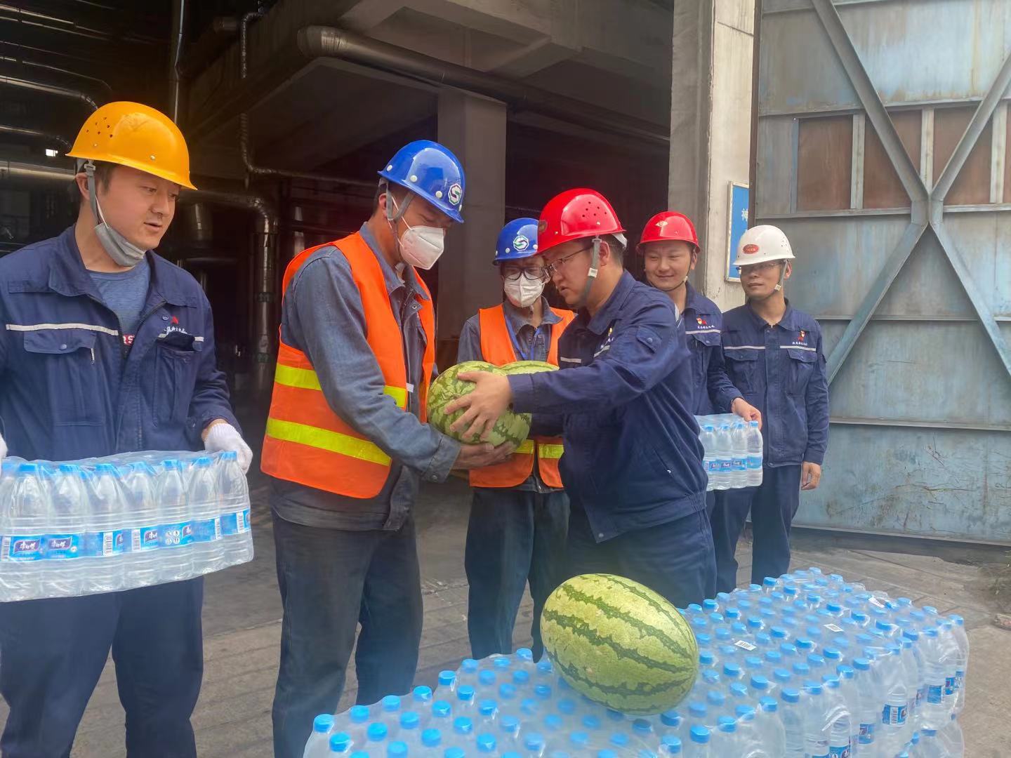 时值盛夏,骄阳似火,检修工作依然在紧张进行中。7月5日,电化真人华球体育官网工会开展“夏日送清凉”活动,工会工作人员带着真人华球体育官网对职工的关心再次来到两大分厂,为一线员工送上了消暑物品,并致以慰问。