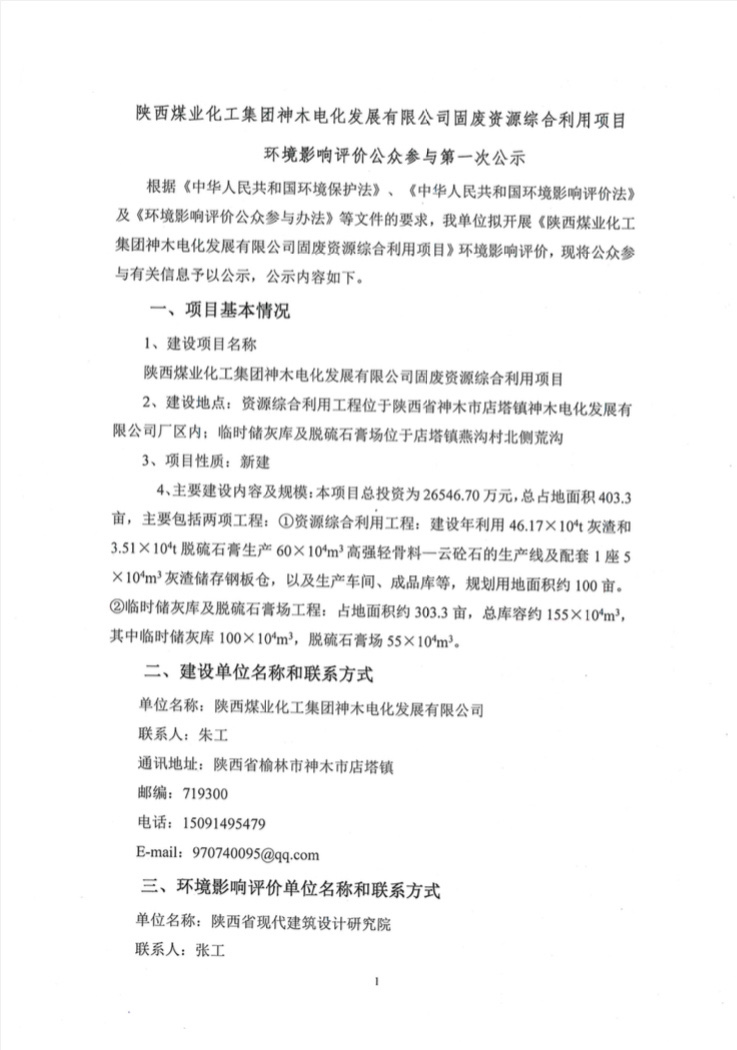 神木电化发展有限真人华球体育官网固废资源综合利用项目环境影响评价公众参与第一次公示