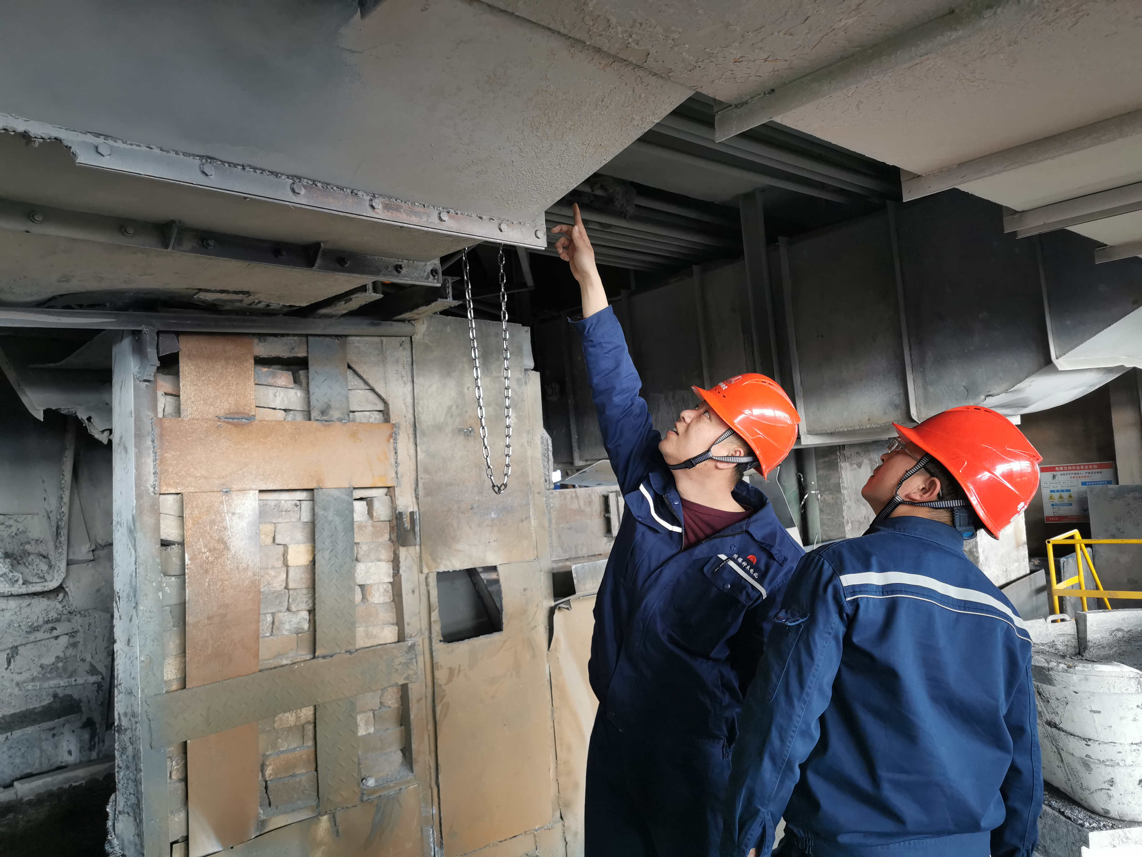 照片2配文:“出炉口耐火砖墙的外壁应该做整张钢板……”走到电石炉出炉口的近前,查找不足,提出设施改造意见。