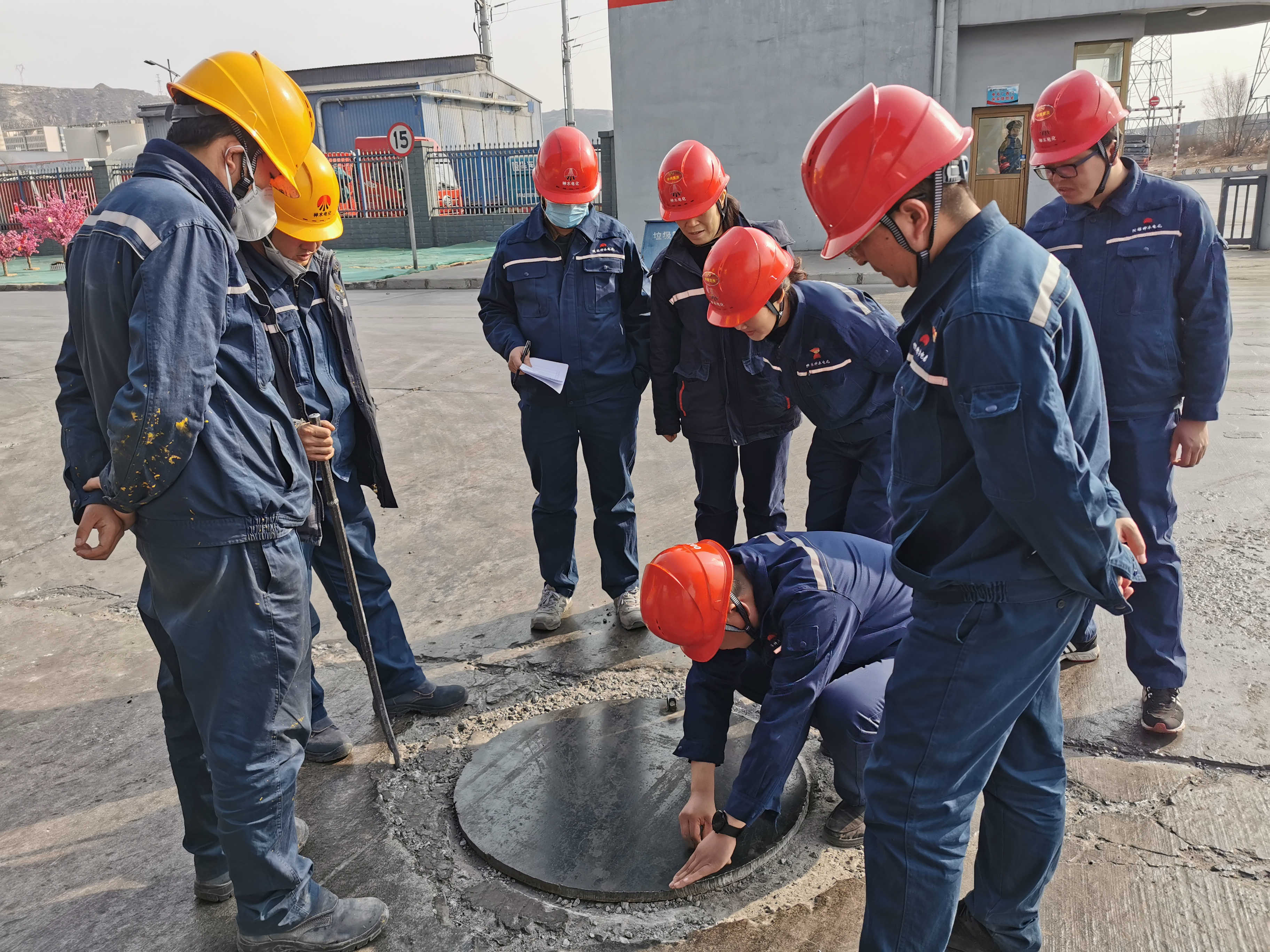 照片3配文:1#炉电石库装车出入口上的这个井盖,在大车的来回碾压下总是移位,看到现场员工正在用钢钎费劲撬动,蹲下来,现场画一个改造图。