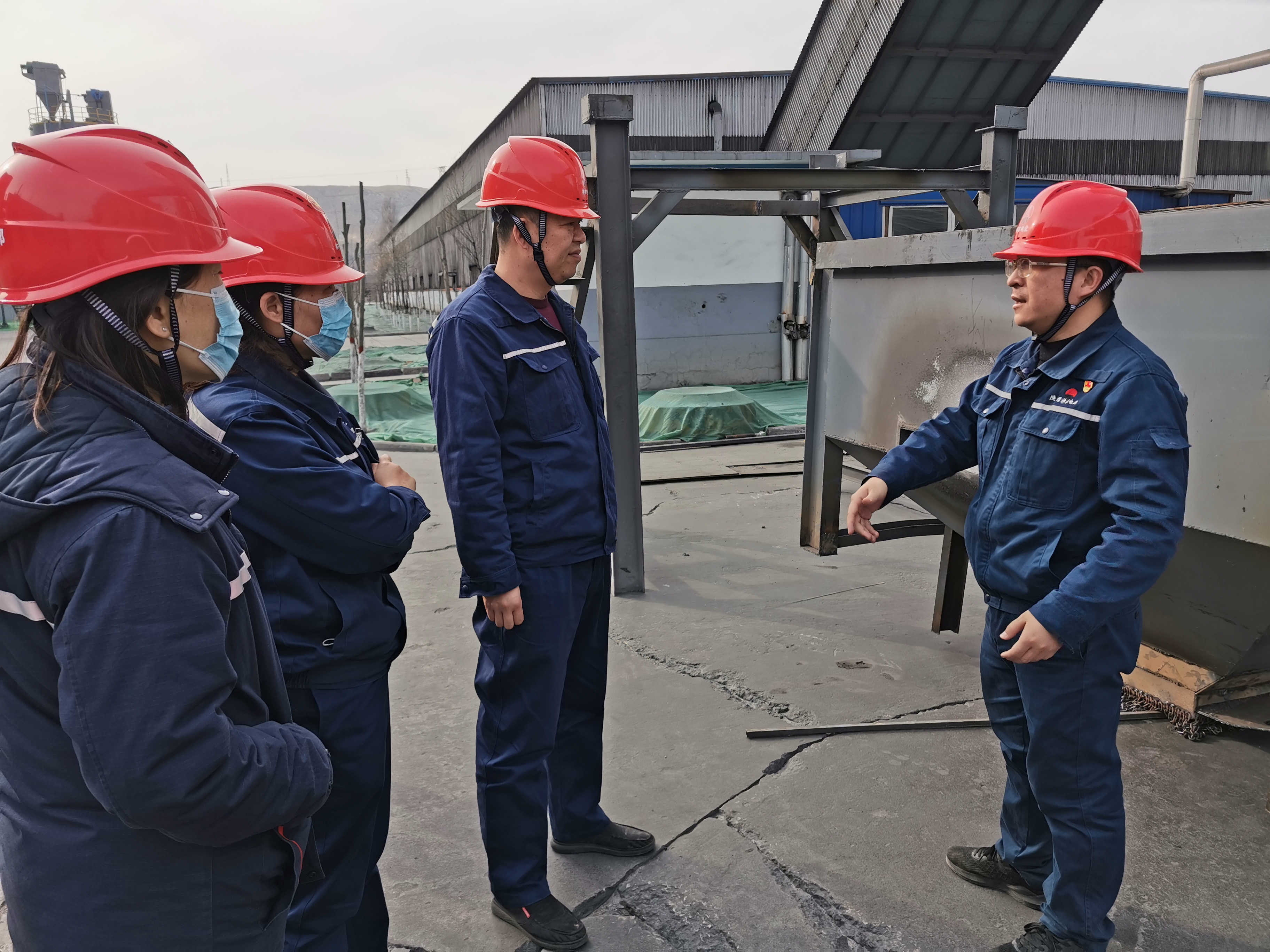 照片4配文:“能不能在装载机上安装除尘?”“能否让喷雾降尘的启停和粉尘浓度连锁?”走进原料库,现场提出降尘抑尘方案。
