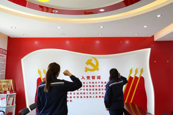 由真人华球体育官网党委统一组织,到新党员项利霞等5名同志的工作岗位进行了入党宣誓,预备党员们在领誓人的带领下,面对庄严的党旗,表达了对党忠诚的决心,接受了一次精神洗礼。党支部书记为预备党员安全帽张贴了党员标识,并嘱托要牢记入党誓词,树立担当意识,立足岗位,贡献自身力量。