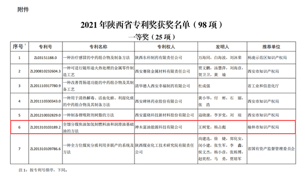 6月30日,从陕西省知识产权局获悉,神木煤化工真人华球体育官网所属富油真人华球体育官网、天元真人华球体育官网申报的“全馏分煤焦油加氢制燃料油和润滑油基础油的方法”和“一种煤热解提质一体化成套系统及工艺”两项发明专利荣获“陕西省专利奖”一等奖。