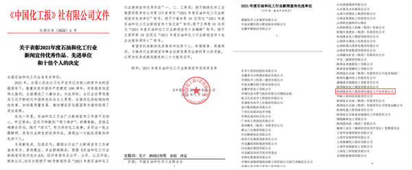 神木煤化工真人华球体育官网荣获“2021年度石油和化工行业新闻宣传先进单位”称号