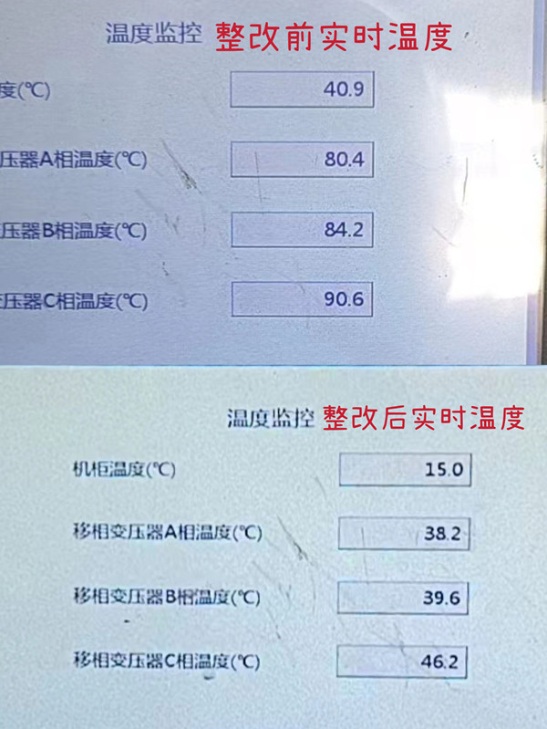 改造方式是将变频器排风口加焊风筒引至外墙,且在对应设备进风墙体增设引风口,引入外部冷空气,方案确定后各部门各司其职,严格按章施工。通过三天的加班加点,变频器配电室温度高的问题终于得到明显改善,室内排风形成了有效的新风循环,室内温度下降至20℃,变频器柜内温度也降至50℃。