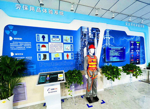 线下培训物理空间包括实操培训区、安全体验区、工艺仿真区、安全文化认知区等。其中,线下培训区配备多媒体电子显示屏、工艺系统沙盘模型,能满足80多人集中学习;实操培训区包括泵与风机培训、焊接培训、电气仪表培训、化验分析培训及钳工培训;安全体验区建设有受限空间实操培训功能、AR设备认知体验、危险工艺VR实训考核、VR事故伤害警示教育体验等10项功能设施;工艺仿真区配备电脑36台,可实现锅炉、汽机、电气、燃运、环保、化水、热控、电石控制系统等为仿真对象的1:1全范围、全过程、高逼真度的仿真培训功能;安全文化认知区重点展示安全承诺、安全理念、安全风险四色图等,使安全管理从制度管理向文化管理提升。从业人员从内心深处逐渐认同安全管理,自觉遵守各项规章制度。