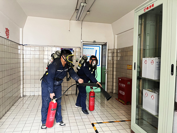 11月28日10时30分,热电分厂演练现场指挥小组组长宣布25MW机组Ⅱ蓄电池室着火事故演练开始。此次演练背景为运行检查人员发现25MW机组Ⅱ蓄电池室有爆炸声,浓烟从门窗窜出,火灾报警器启动。检查人员立即汇报班长:“我是演习人员贺利花,老厂Ⅱ蓄电室内有爆炸声,浓烟从门窗窜出。”