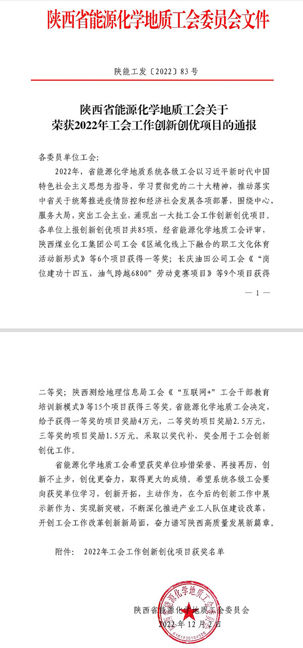 神木煤化工电化真人华球体育官网荣获2022年陕西省能源化学地质工会工作创新创优项目三等奖