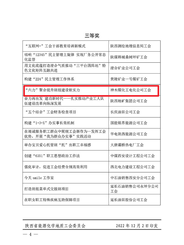 近日,神木煤化工电化真人华球体育官网“‘六力’聚合提升班组建设软实力”项目荣获2022年陕西省能源化学地质工会创新创优项目三等奖。