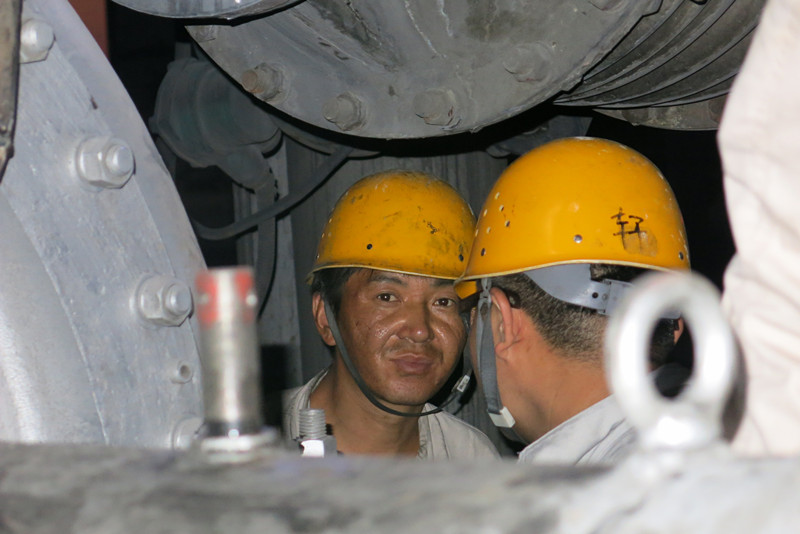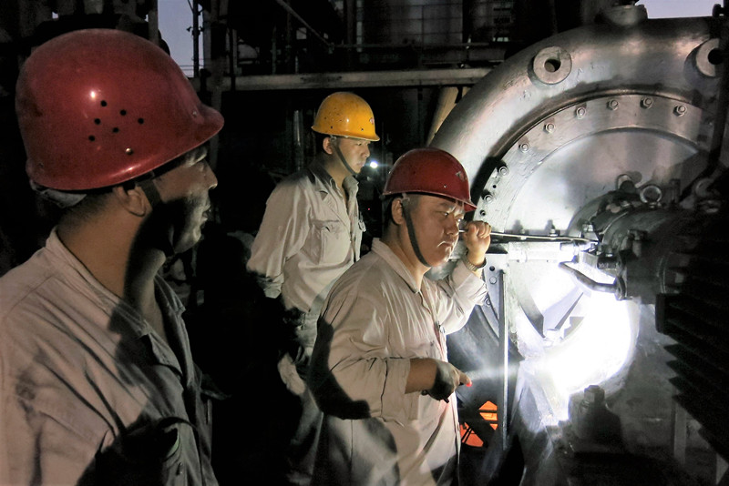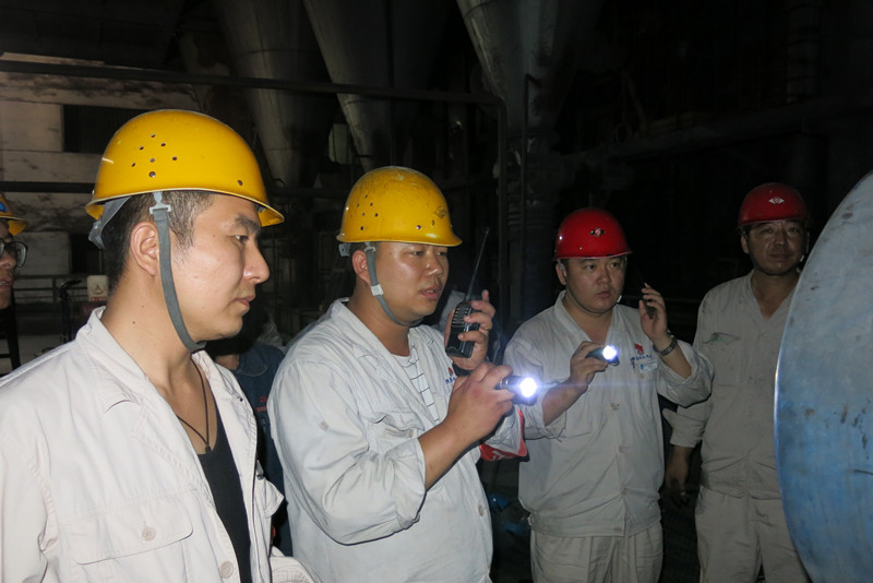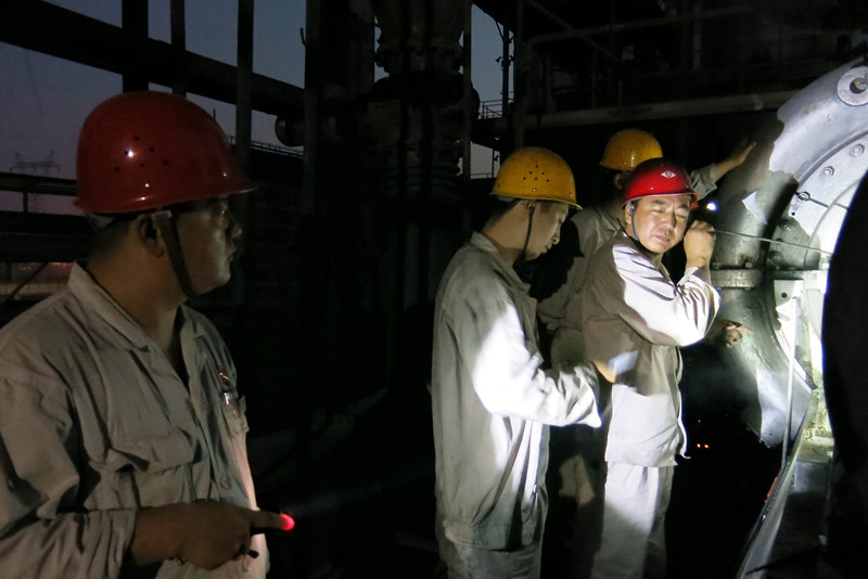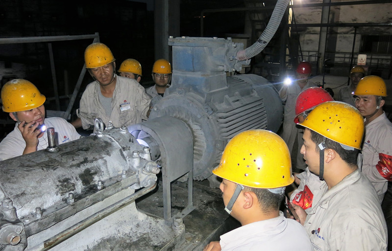 在检修现场,笔者看到电石分厂厂长、党支部书记折永丰,他正和现场检修负责人宋凯、赵小虎交流现场抢修情况,另外几名维修工正两三个人一组,忙得不亦乐乎,大家一门心思都在净化风机上。