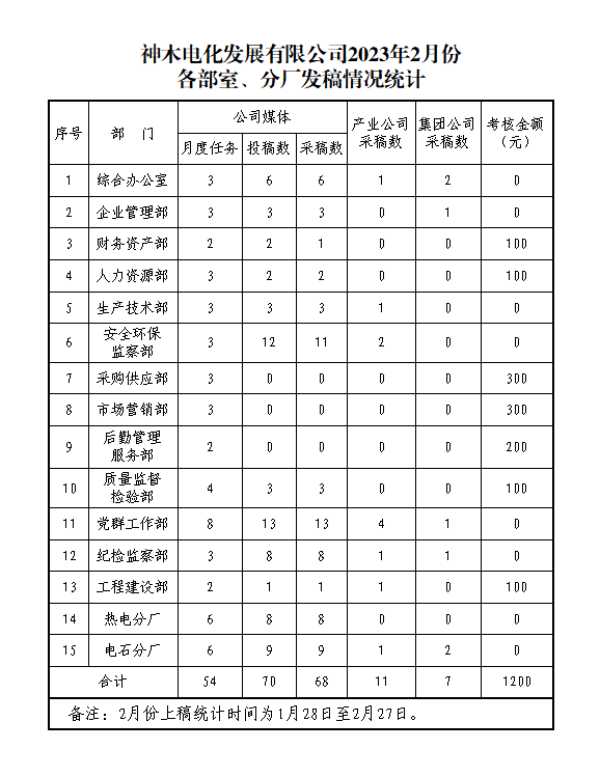 2023年2月份各部室、分厂发稿情况通报