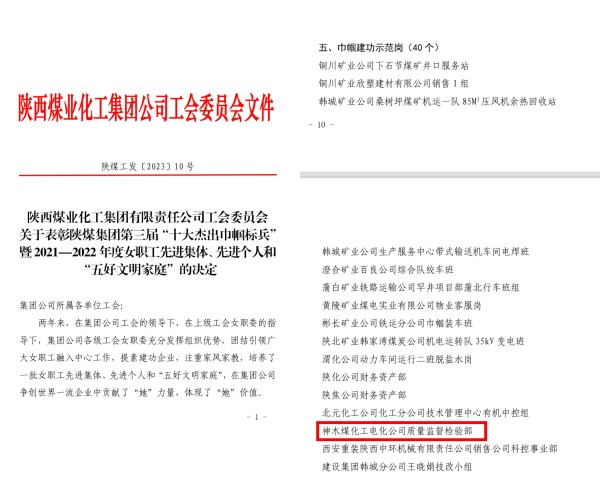 近日,神木煤化工电化真人华球体育官网质量监督检验部被陕煤集团授予2021—2022年度“巾帼建功示范岗”荣誉称号。