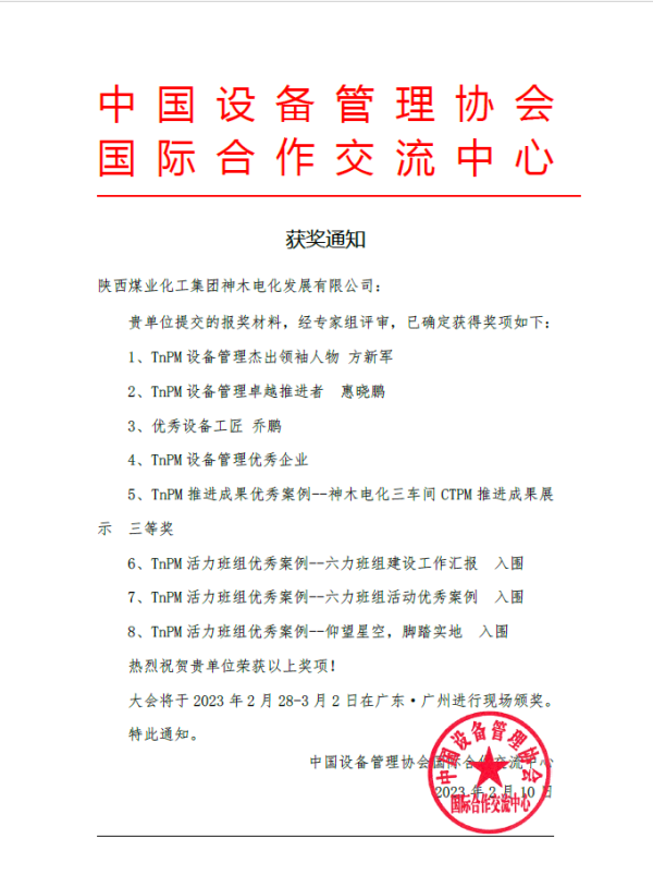 电化真人华球体育官网荣获TnPM设备管理优秀企业、方新军获得TnPM设备管理杰出领袖人物、惠晓鹏获得TnPM设备卓越推进者、乔鹏获得优秀设备工匠称号、三车间CTPM推进成果展示获得TnPM推进成果优秀案例三等奖。