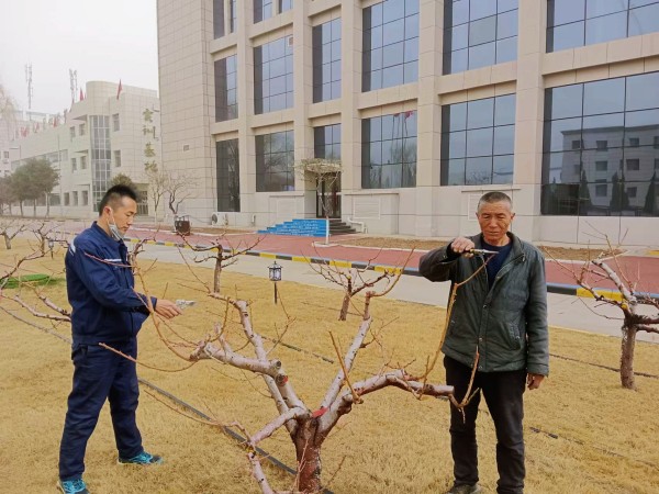 后勤管理服务部邀请果树培育基地的人员对果树修剪工作进行指导。果树培育基地的负责人说道“这树是一树四开,即东西南北四个方向开枝,剪树的目的,其一,为维护树形,让树形更美观。其二,剪掉病枝,弱枝和枯死枝,防病虫和利生长。”剪的时候把每枝直向上长势好的留为主枝,其余为副枝,修剪时要继续将主枝、副主枝及中心主干的延长枝头部剪掉,即短截,以利长高长圆;并说每个小枝挂果时只能留一个果,第一年挂果不能贪多,否则会影响果树的生长和成活。