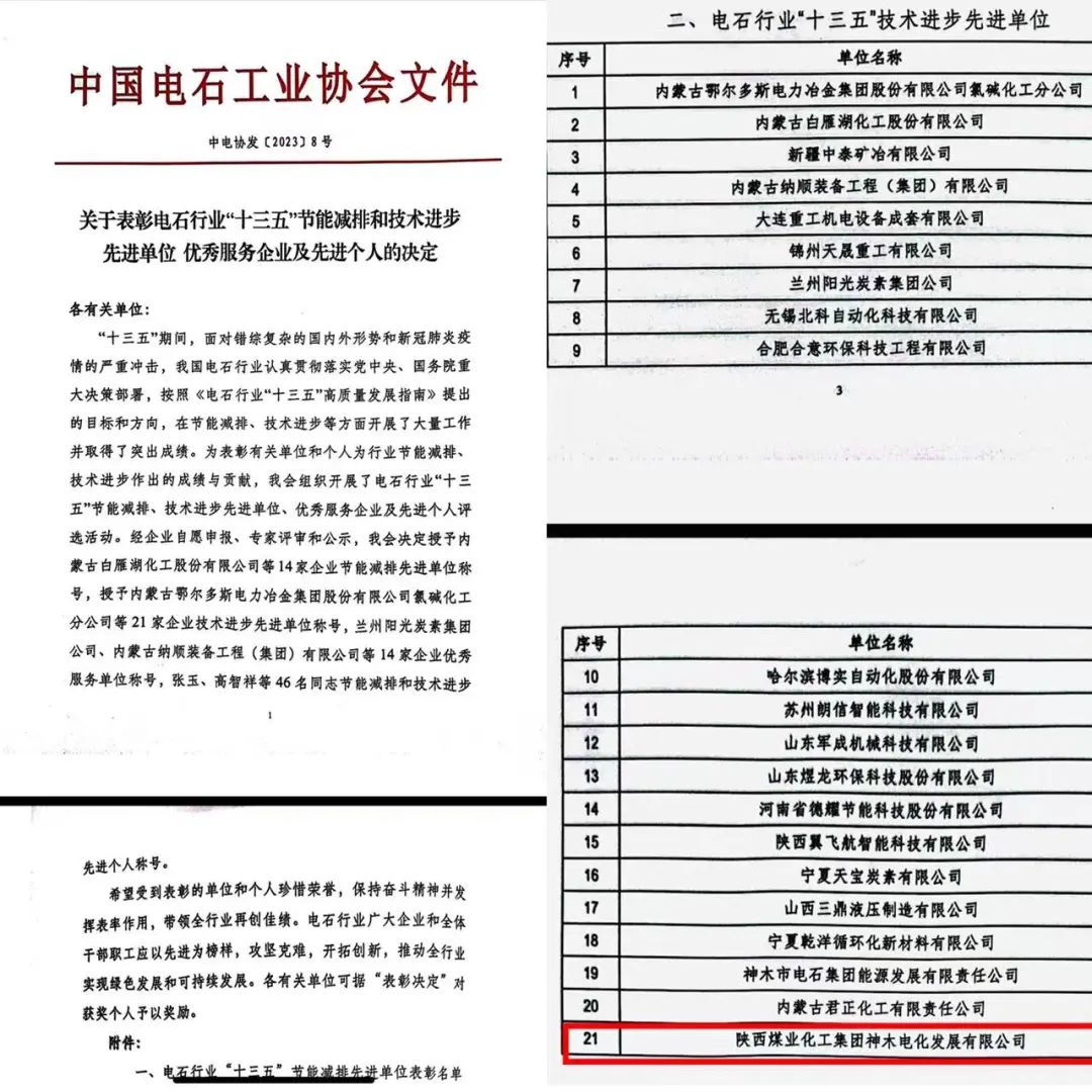 神木煤化工电化真人华球体育官网荣获中国电石工业协会“十三五”技术进步先进单位称号