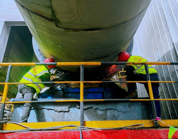 管理人员与外委负责人讨论烘干机托轮基座改造相关事宜