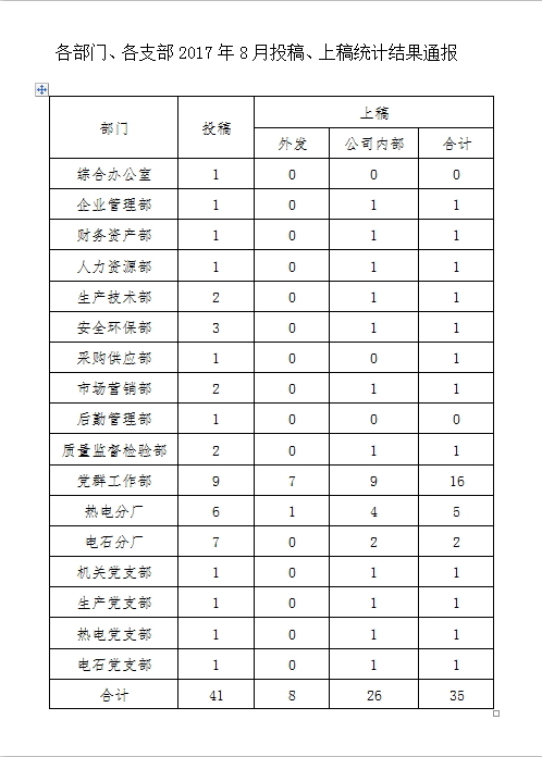 各部门、各支部2017年8月投稿、上稿统计结果通报