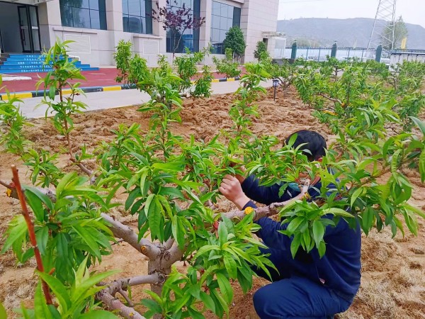 春夏之交,是桃树挂果的重要时期。经过桃树管理的“修枝”环节,眼下,电化真人华球体育官网绿化管理员正在忙碌地进行疏果工作,合理的留果可以保证每个果实得到充足的营养。他一棵一棵进行搜索,一枝一枝地摘,生怕漏过每个小枝,眼睛直直地盯着,手不停地忙碌着。