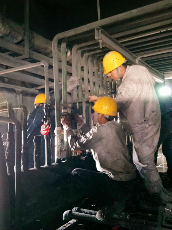 走进大修现场,各项工作有条不紊的进行着。这边水分配器阀门更换紧罗密布进行着,那边正按严丝合缝的标准安装着电石炉炉盖;这边净化刮板机链条更换如火如荼,那边环形加料机找平一丝不苟;这边检查更换夹紧缸,调整夹紧力工作专心致志,那边变压器检查、保养细致到位。全体检修人员齐上阵,检修现场真是热火朝天!在大修的这些日子里,检修人员面对高温炙热的天气,没有退缩、畏惧,任汗水浸湿衣衫,任高温烘烤脊背,加班加点,连续工作,始终保持着昂扬的工作斗志。车间工段长放弃与家人团聚的时间,每天坚守工作岗位,随时协调处理现场的问题,做到把好安全关,把好质量关。分厂领导严格执行领导带班值班制度,发挥走动式管理的积极作用,每天都深入检修一线,及时解决检修过程中遇到的瓶颈问题,确保检修顺利进行。