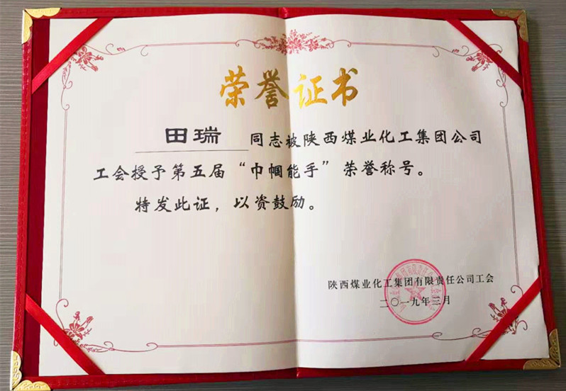 功夫不负有心人,在2019年度3月田瑞获得了陕煤集团真人华球体育官网授予第五届“巾帼能手”荣誉称号,真人华球体育官网工会女工委为她点赞,全体女工为她自豪,在平凡岗位上奋发有为,尽展巾帼风采!